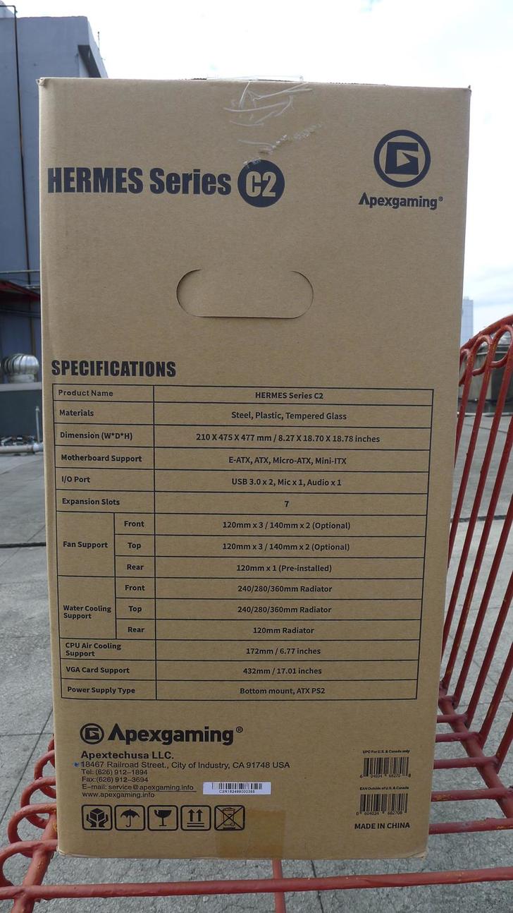 ▼兩側標註了Hermes C2的特色和詳細規格,內部空間夠大,所以可以容納約43cm的顯示卡,CPU散熱器的高度也能支援到17.2cm,最多可安裝7個風扇,且水冷排最大可以使用360mm,對一個中塔式機殼來說擴充性算是相當完整