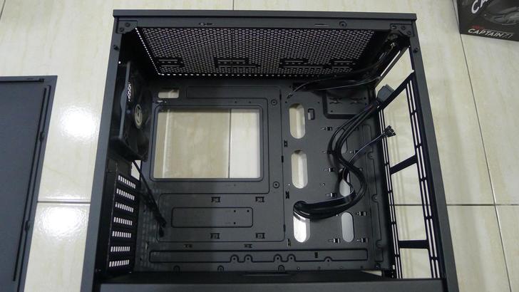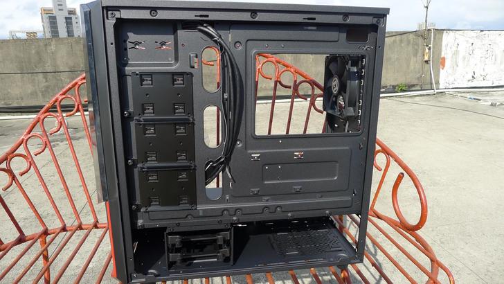 ▼內部空間展示,機殼後方內建一個12cm風扇,可以支援最大的E-ATX主機板,走線孔位很多,包括下方遮罩蓋和左上角CPU電源及主機板右側三個