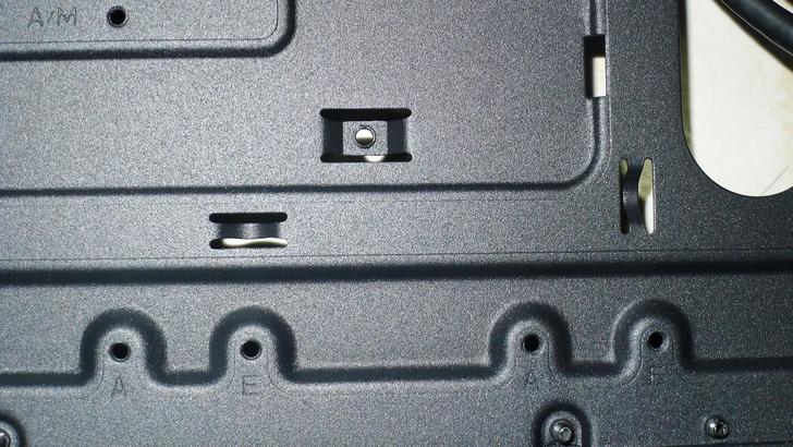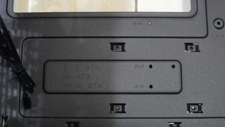 ▼機殼內部有貼心提醒各尺寸主機板的螺絲孔位,E代表EATX,A代表ATX,M則是MATX,根據其位置鎖上銅柱即可