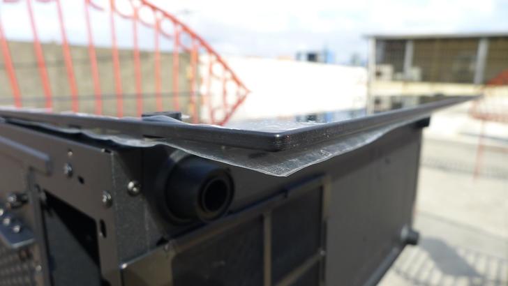 ▼前面板的上方是燻黑透明壓克力,下方則是鐵網設計