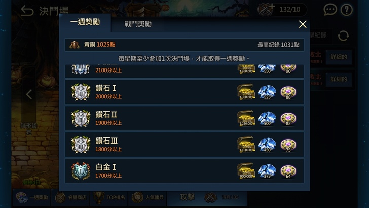 (首先是決鬥場,一周結算一次,排名的段位越高,能獲得的古代鑄幣越多,第一名衛冕者一次就有255個,超羨慕)