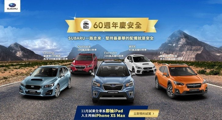 慶祝SUBARU 60周年,11月份全台展開行銷活動將於每個周末規畫安全賞車試乘,更加碼舉辦「天天試乘抽iPad」及「領牌再抽全新iPhone XS Max」的抽獎回饋,希望給予購買者最誠意的購車禮遇。