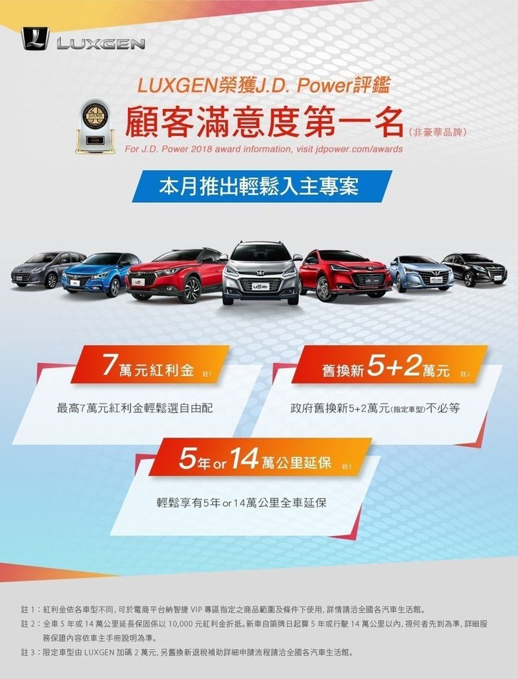 台灣唯一汽車自主品牌LUXGEN,榮獲J.D. POWER評鑑顧客滿意度第一名,11月推出輕鬆購買專案,可享7萬元紅利金輕鬆選自由配,還有政府舊換新5萬元外,限定車型再由LUXGEN加碼兩萬元補助,並享有5年或14萬公里全車延長保固。