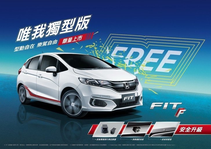 Honda FIT、Honda CITY「唯我獨型版」外型以型動跑格車身設計、搭載專屬「F銘版」,新世代夢想馳騁賽道;在原有的9大主動安全系統和被動安全基礎之上,升級搭載「前、後雙鏡頭行車記錄器」、「倒車攝影系統」、「前偵測雷達」等安全配備,安全性效能具有領先標竿。