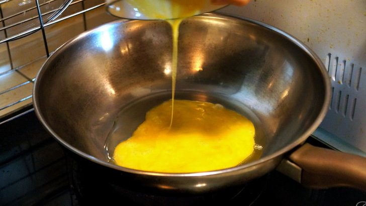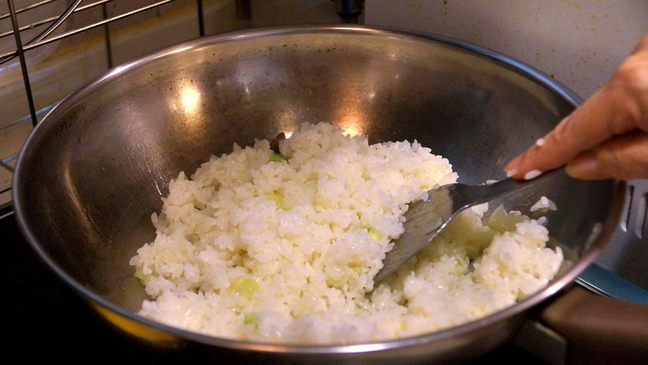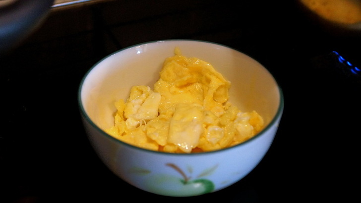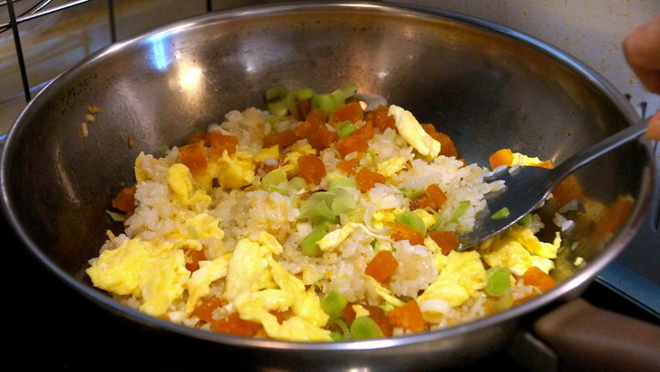 把剛剛煎好的雞蛋,切丁的烏魚子與蒜段加入