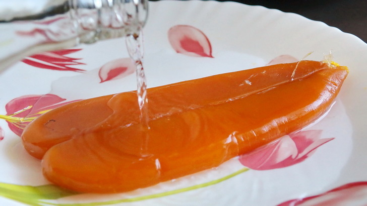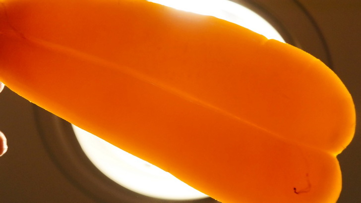 你看,將烏魚子放在燈光下一照,整個烏魚子金黃透亮,可見真的有放血。