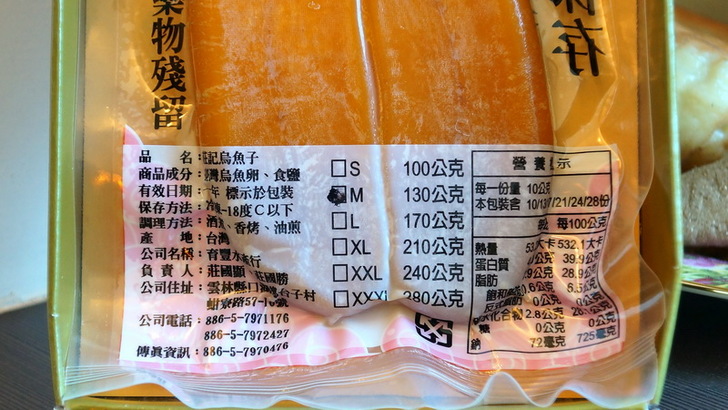 我上網研究了一下,這盒烏魚子是來自雲林縣口湖鄉,這個地方我從來沒有去過,但我知道口湖鄉是台灣烏魚的主要產地之一,因為野生烏魚的產量逐年減少,台灣人對烏魚子的喜好又歷久不衰,在需求創造供給之下,台灣漁民投入了烏魚養殖的行業,早期因為因為養殖技術的關係,很多人都認為養殖的烏魚子口感略遜野生的烏魚子,但隨著養殖技術的進步,現在養殖的烏魚子口感完全不輸野生的喔。