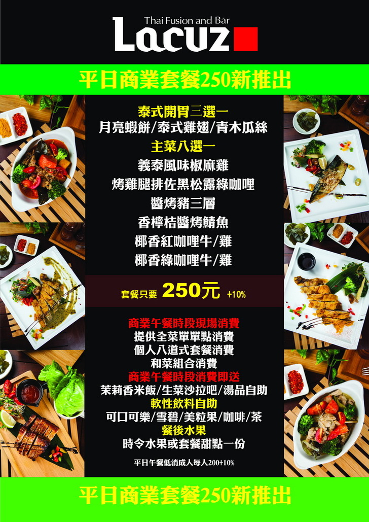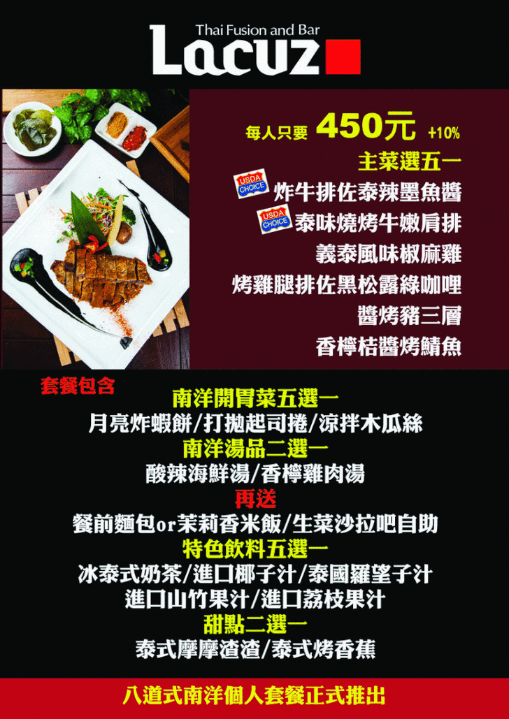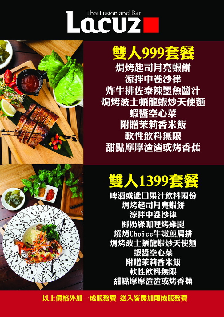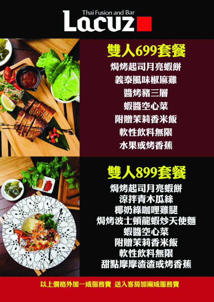 在這裡,我要的是吃巧吃好不要吃太飽,「Lacuz Thai Fusion & Bar首都松山館」提供了單點菜單,與多種價位的套餐菜單。