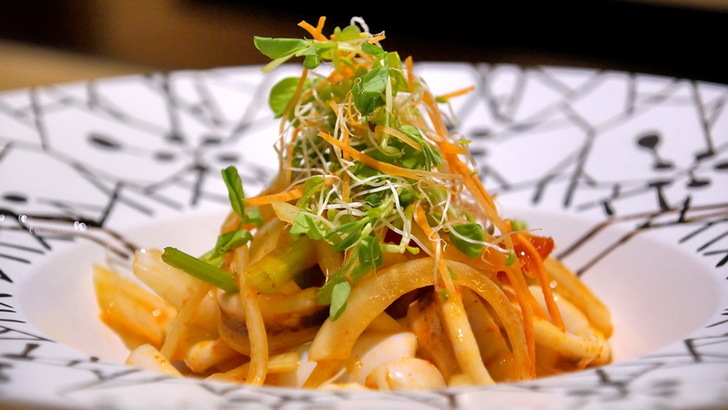 這道菜的作法其實不難,重點是川燙中卷的時間要拿捏得好,燙得太久中卷肉質會變硬,燙過之後還要冰鎮,這樣口感才會好。老媽在家裡總是抓不好川燙的時間,還是吃餐廳的吧。這裡的涼拌中卷沙律,中卷給得很大氣,切得很大塊,吃起來口感適中不會硬,一入口先是品嚐到醬汁的酸辣味,接下來是洋蔥些許的嗆辣味,仔細咀嚼中卷後卻又出現中卷本身的鮮甜味,這道菜要慢慢品嚐才能吃出多層次的口感。