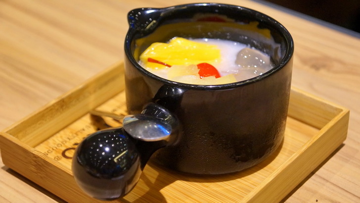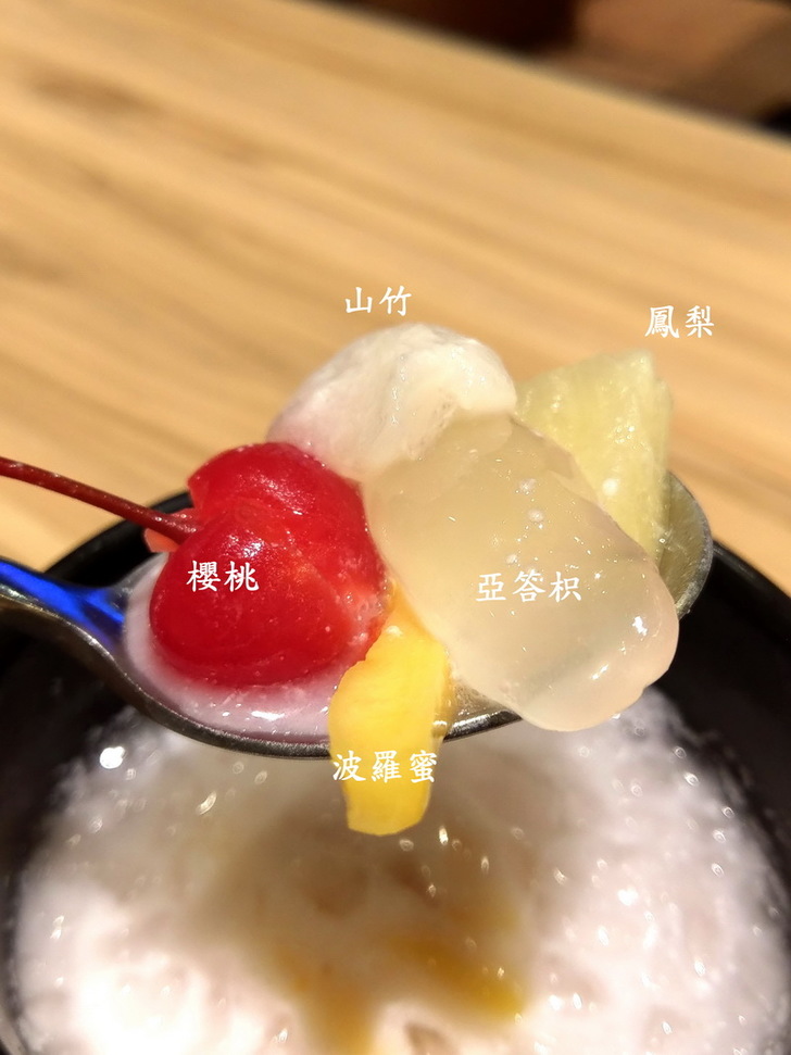 摩摩喳喳裡的配料還不少,有櫻桃,鳳梨,波羅蜜,亞達枳等等。餐後吃一點甜食轉換一下口感很不錯。