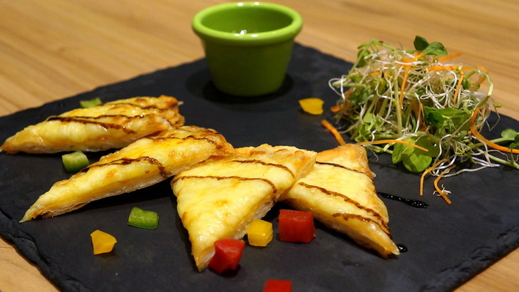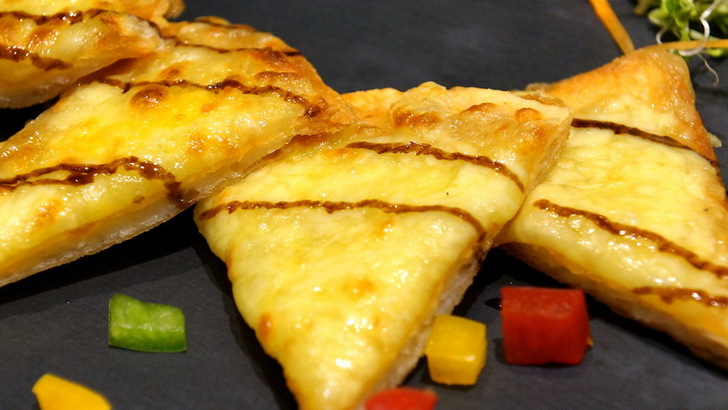 這道菜真的很有趣,大家心目中的月亮蝦餅,就是蝦餅油炸後切片沾點梅子醬食用,但是這裡的月亮蝦餅,除了油炸之外上面還加了滿滿的起司去烤,烤過的蝦餅,口感比較酥脆,感覺好像在吃義式的薄脆Pizza,蝦餅雖然不是很厚,但可以明確的吃得到蝦肉,除此之外,蝦餅出乎意料的與起司的鹹香合拍,不沾梅子醬就很好吃,但如果沾點梅子醬的話,口味又是另一種清爽的酸甜滋味。