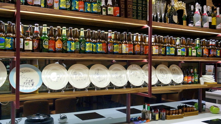 裝飾用的酒瓶下方有一排盤子,進來時肚子超餓沒有好好仔細看看盤子上的簽名。