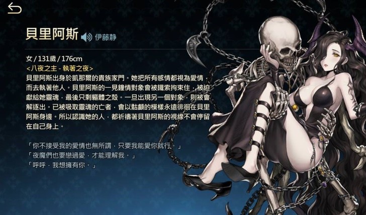 從故事情節中可以看到,她一旦愛上了就絕不放手,就算化為骷髏也照樣愛你,不過如果貝里阿斯愛上了其他人,被吸取靈魂的你就只能成為骷髏永遠的徘徊在她身旁...