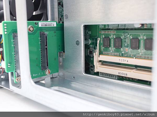 拆了側板後更容易看到機體內部的構造,除了硬碟的SATA 6Gb/s插槽外,還能看到兩個SODIMM DDR3L的插槽,原本已經裝了一支4GB的RAM,有需要的話還可以再自行增加一支,最多支援到8GB(2x4GB)