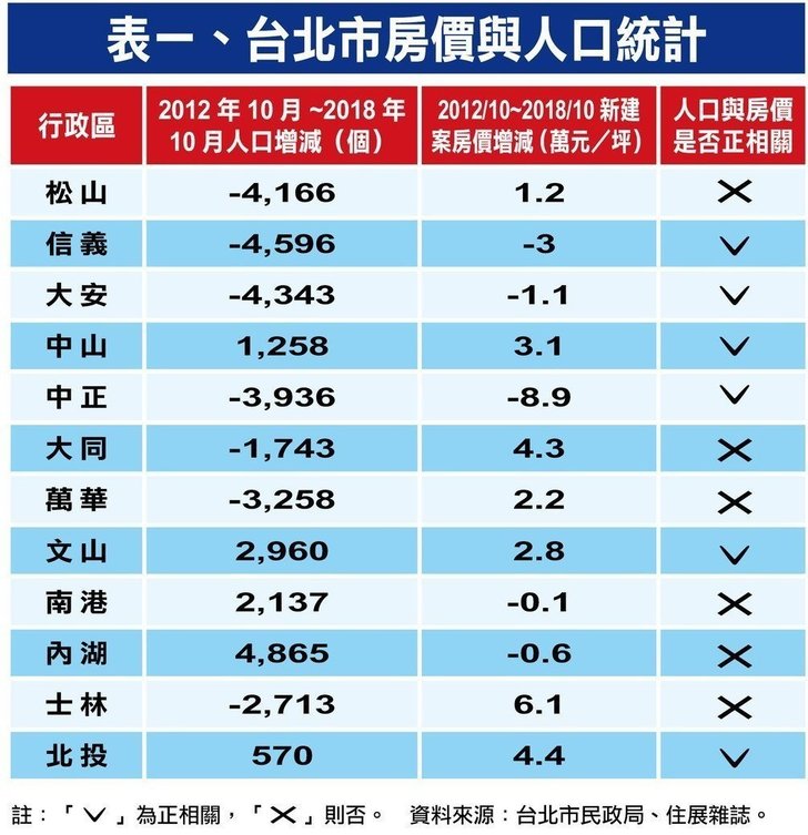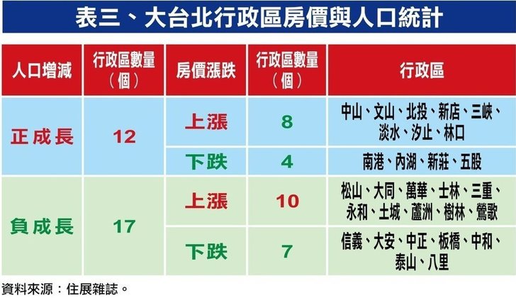 我們習慣以人口數來衡量房價是否有投資或轉手增值空間,但根據住展雜誌統計,出乎意料是台北共29個主要行政區人口數量與房價變化,其中只有15個房價與人口漲跌呈現正相關,另有14個行政區與人口負相關,正相關機率僅約二分之一。