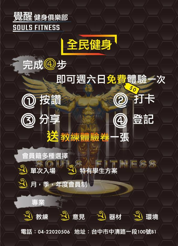 粉絲專頁: 台中健身房 北區中清店 Souls Fitness覺醒健身俱樂部