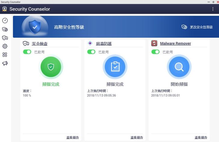 ▲最新版本QTS 4.3.5 中才擁有新功能「安全評估中心」結合安全檢查、防毒掃描,尤其是我們公司在NAS中儲存了上萬筆個人證件的資料,這些安全防護絕對是不可或缺的!