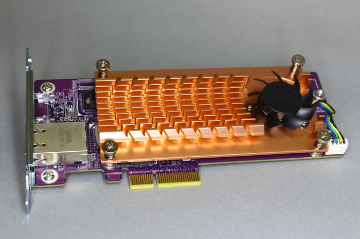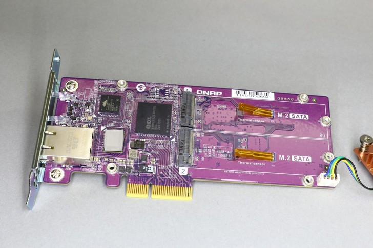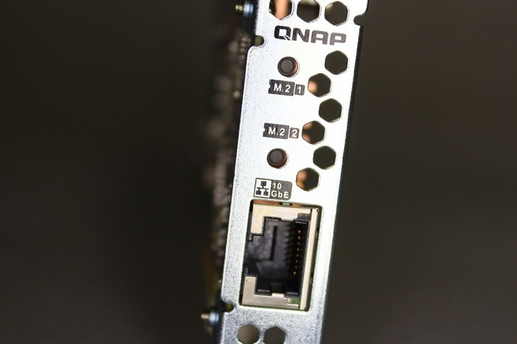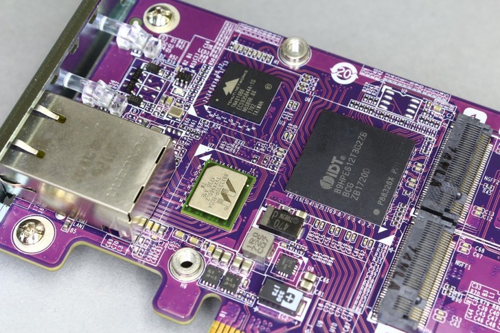 ▲卸除散熱模組後可以看到10GbE網路模組與 2 組 M.2 SSD 埠,這 2 大功能能合併在同 1 張擴充卡上實在少見。