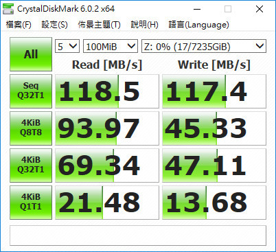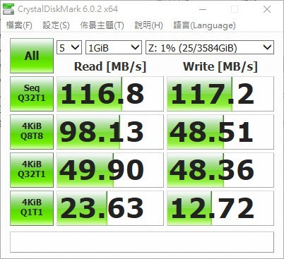▲在RAID 1的架構下測試讀取每秒可達 116.8 MB/s、寫入可達 117.2 MB/s,速度還算是非常堪用。