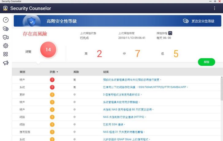 ▲筆者刻意調整NAS設定,系統就會建議用戶設定連線、權限等相關參數,以讓NAS達到最高安全標準。