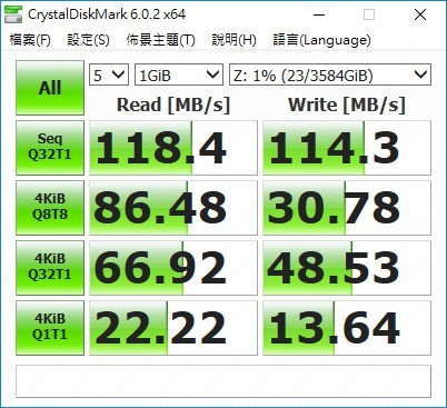 ▲設備端直連NAS基地台後,硬碟讀寫速度測出最高讀取118.4 MB/s;寫入114.3 MB/s的數據。