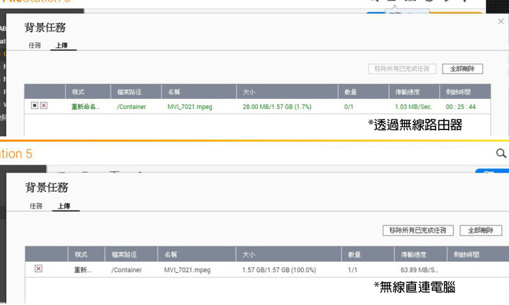 ▲實際測試檔案傳輸速率就有極大的差別,一般透過NAS>無線路由器>電腦的速度因為位置配置較遠的緣故速度非常緩慢;但透過NAS>電腦直接WiFi連線的方式傳輸速度更是飛快!