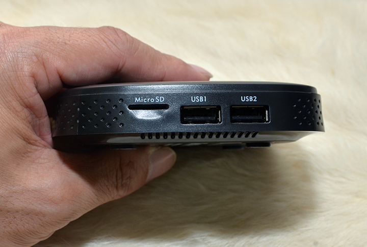 ▲ A3+有效運用後方與側面空間,才能讓A3+約一個手掌大,側面為可擴充MicroSD卡槽、兩個USB埠,可外接滑鼠或鍵盤;一般市面常見的電視盒都把插槽集中後方,所以體積相對較大。