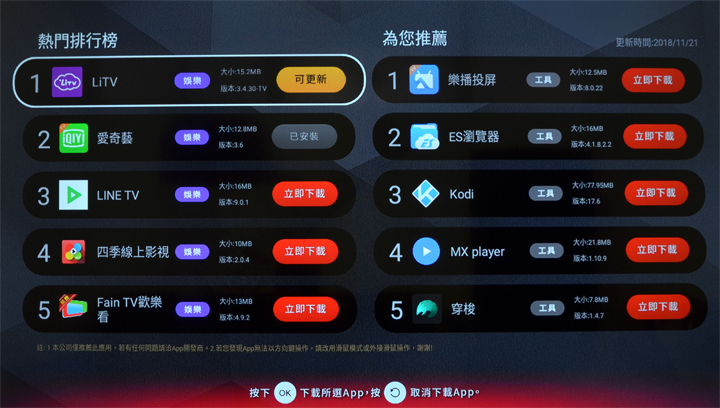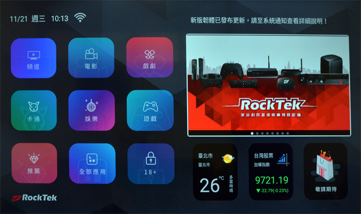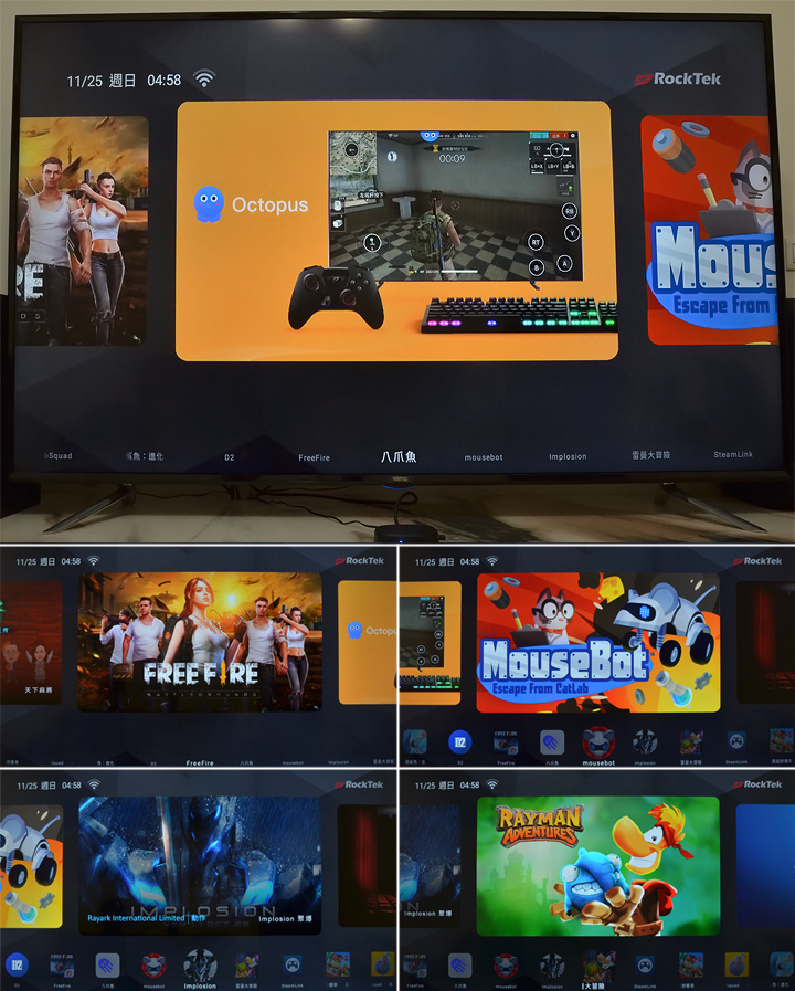 ▲ 在影視預覽區部份,點選此區塊就會自行放大,它除了可以預先觀看頻道更新狀況與系統更新的資訊,如果本身是店家的用戶,它就是一個很好的推播工具;遊戲部分: 除了RockTek遊戲手把外,一般支援Android的有線和無線搖桿也都可以玩喔。