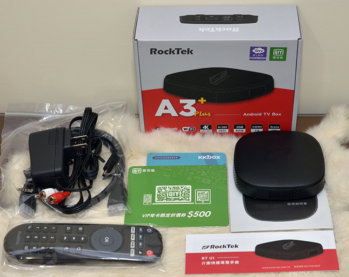 ▲ 內容物 A3+ 主機外,還有電源線、RCA線、HDMI 線、遙控器、安裝使用書,以及KKBOX 21天免費體驗卡 與 愛奇藝VIP年卡500元折價券(贈送 LiTV 頻道餐三個月、CATCHPLAY每月10部熱門影片免費看)。
