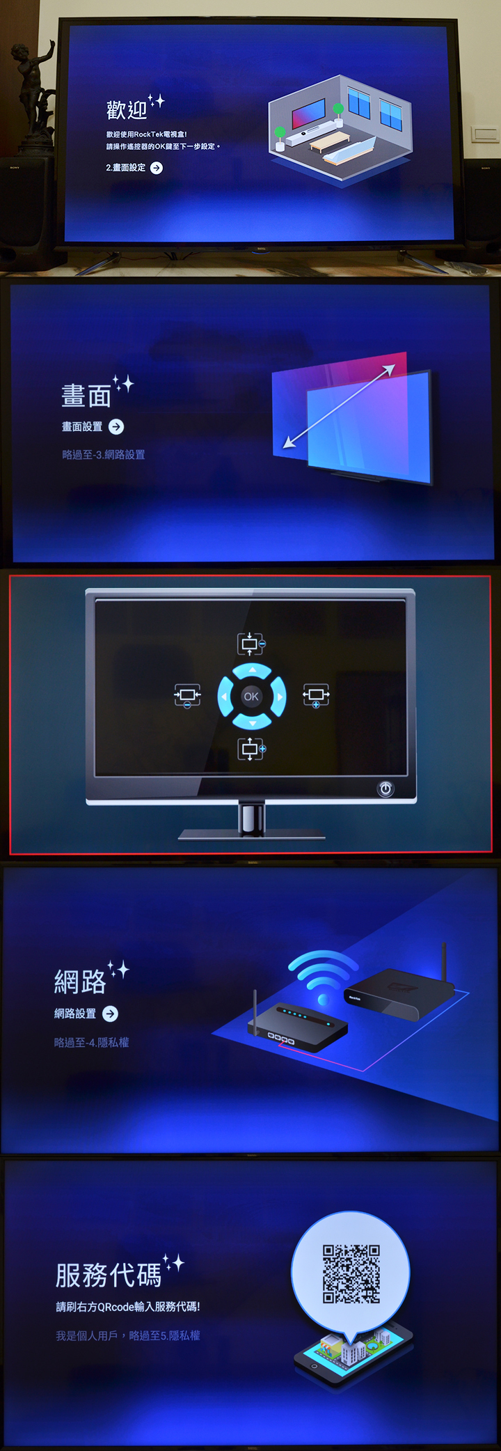 ▲ 首次開機,可依據家裡螢幕的大小、解析畫面、網路連線來進行設定,操作方式只要依照螢幕步驟,就可輕易完成!