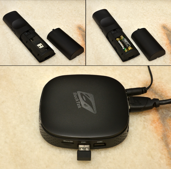 ▲ 首先將 RC01V 內的無線接收器安裝至 A3+ 電視盒側邊USB 插槽上,接下來將四號電池安裝至遙控器內。