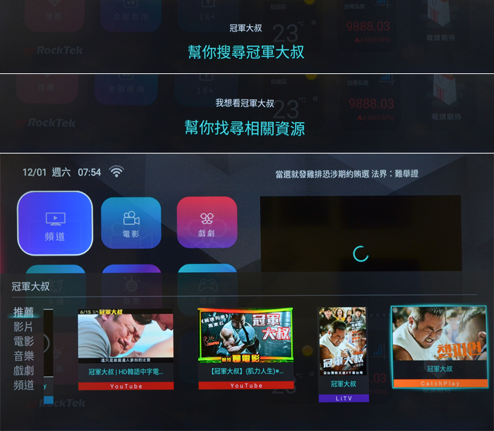 ▲ 假如要看冠軍大叔也沒問題!對著遙控器上的專屬語音控制按鍵後,說出『冠軍大叔』,它會將電視盒內LiTV、YouTube、CatchPlay、KKTV 所搜尋到的結果。