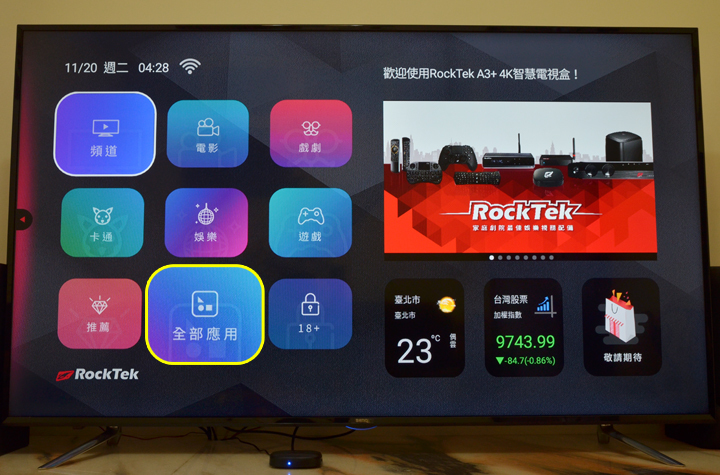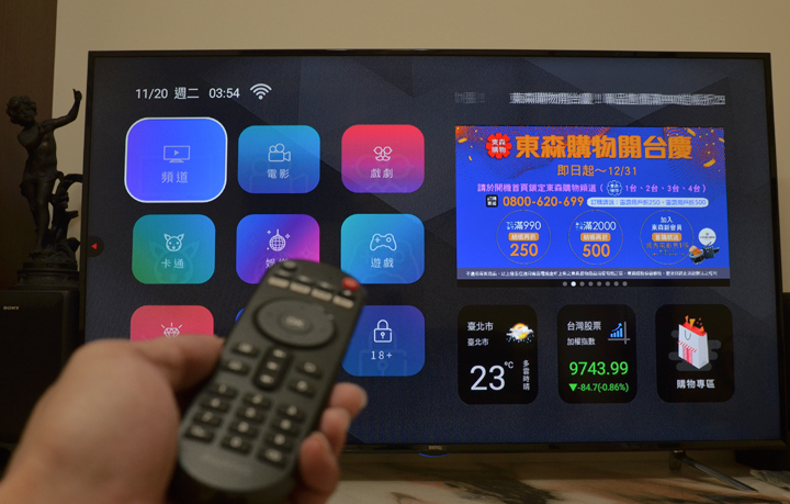 ▲ A3+的『 RTUI 』互動介面是從「心」出發要給使用者最佳的體驗,所以介面簡單明瞭且更貼心,它直接歸類頻道、電影、戲劇、卡通、娛樂、遊戲、推薦、全部應用,以及18禁等九大區塊,右邊則是線上購物廣告、影視預覽區、天氣資訊區與即時股票加權指數。