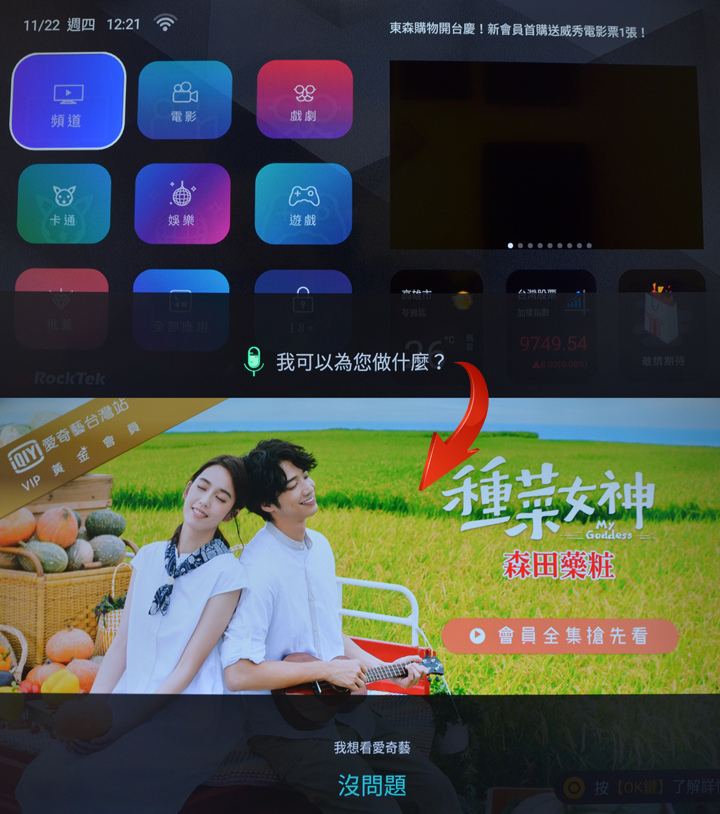 ▲ 首先按下遙控器上的專屬語音控制按鍵後,說出『我想看愛奇藝』,它就會自動切換至『愛奇藝』影音平台,即使只說『愛奇藝』也沒問題!