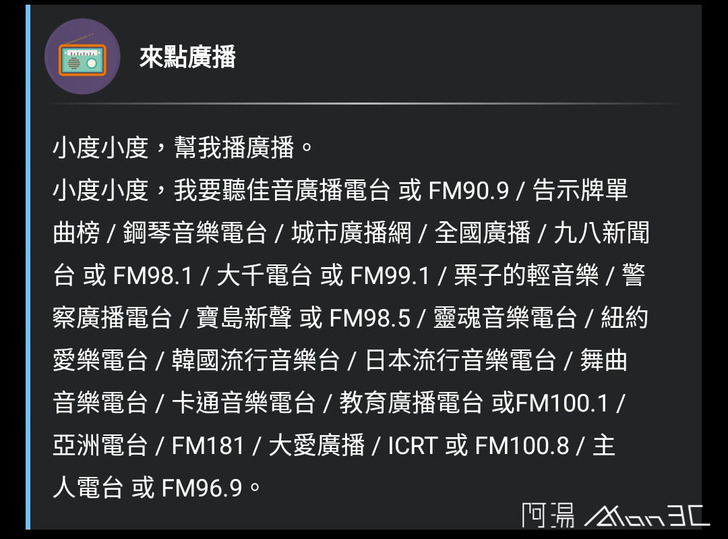 其中最常用的當然是語音助手,此款產品的語音助手搭載的是 百度的DuerOS ,且有針對台灣的一些服務做在地化例如 : KKBOX、計程車叫車(尚未開放)、廣播電台,那ATon就依它的功能來做一些實測&介紹