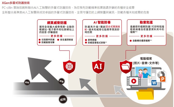 首先先來介紹2019年PC-cillin雲端版創新整合AI人工智慧,讓防毒軟體更加聰明靈活,畢竟人在成長,病毒也在成長,所以若有了人工智慧的加入,這樣就可以應付詭譎多變的病毒和惡意威脅