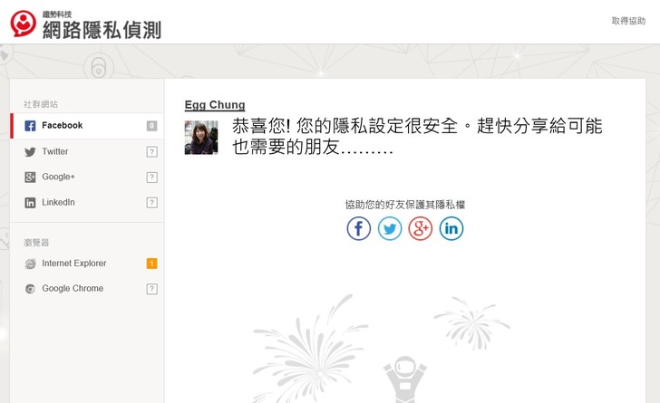 先介紹網路隱私偵測,這個還滿適合我,其實我是個永遠都搞不清楚FB的隱私設定,而2019年PC-cillin雲端版它利用導引和推薦的方式,讓我能清楚的了解我設定了那些隱私,若我設定的隱私沒有問題的話,就會出現下圖的安全訊息,以後再也不用怕穩私莫名其妙的曝露在網路世界囉~~