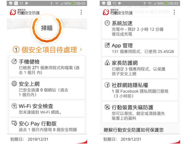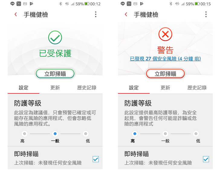 【手機健檢】這個功能就好像是基本的防毒功能,它掃描手機內的APP是不是藏著病毒,但是因為我的手機都是下載合法的APP,所以沒有病毒,是一隻健康寶寶的手機哦~再次強調,這個功能連三歲小朋友都會使用,因為真的只要一鍵就行了~