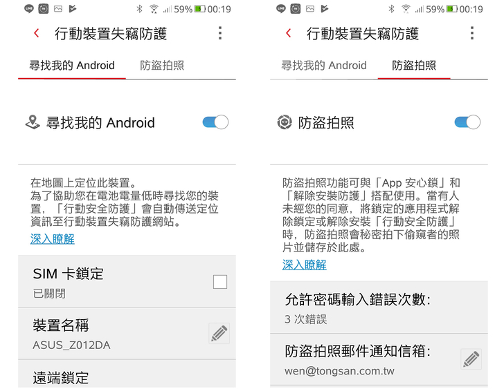 【行動裝置失竊防護】最後介紹一個手機最需要的功能,因為手機遣失的機會很大,當你開啟這個功能時,可以快速的了解手機的位置,而且若妳的手機並非經過你而被破解時,這個功能內的防盜拍照就會啟用,你就可以利用這個開始進行報案動作,感覺就是很厲害的樣子,但我希望我用不到~哈哈哈
