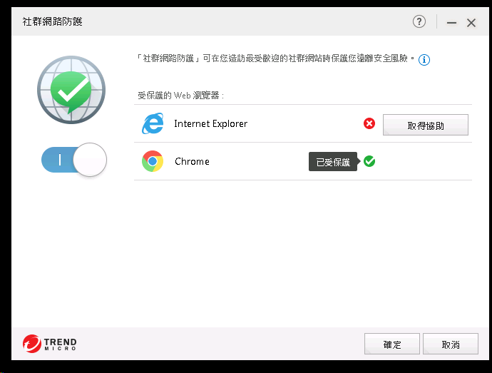 ▲點擊「社群網路防護」,可以保護你已安裝的瀏覽器,如果呈現X的狀態為未受到保護,這時可以按旁邊的「取得協助」會有詳細的步驟。