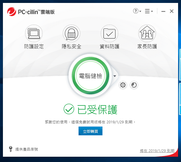PC-cillin 2019 雲端版主畫面也相當簡潔,主要為四大功能設定(防護設定、隱私安全、資料防護、家長防護)以及中間的圓形按鈕電腦健檢查,並且可以分為快速掃瞄、完整掃描、自訂掃描,而在右方也有完整的設定按鈕以及排程設定按鈕。