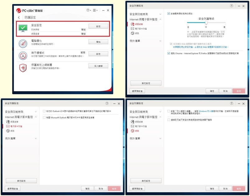 在" Internet與電子郵件監控"頁面可以設定瀏覽網頁時的即時掃描等級,這個設定也會影響網頁瀏覽開啟的速度,一般來說開啟速度差異感覺不會太明顯。另外也有防火牆的增強選項可以進行設定。而有使用Outlook也可以在電子郵件防護進行安全的檢測。