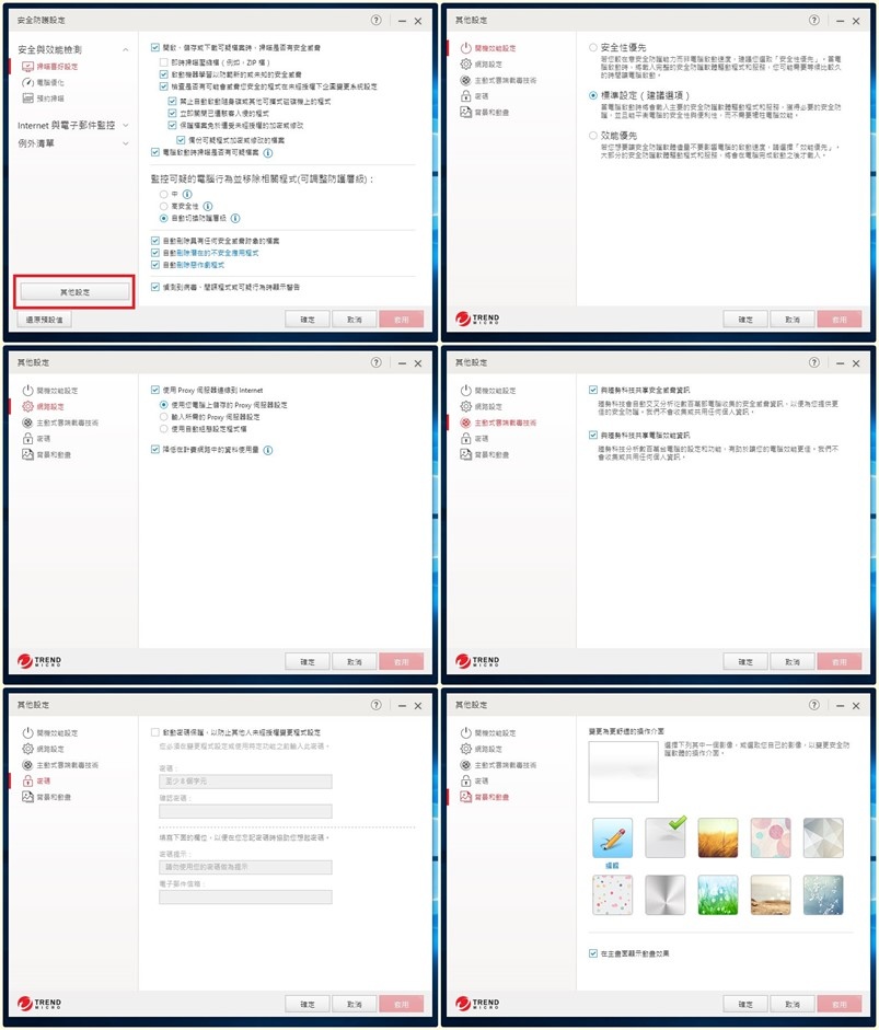 而在安全設定其中也分為"安全與效能檢測"、"Internet與電子郵件監控"、"例外清單"等三大類以及最下方的"其他設定",其中"安全與效能檢測",是最主要的安全掃描相關設定,相對的設定也是主要會影響掃描的效能。電腦的優化選項與預約排程掃描也是在這邊進行設定