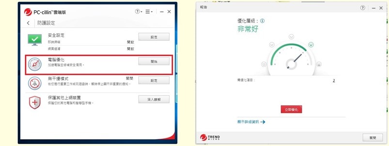 電腦優化會自動檢測相關項目,再偵測完之後可以選擇要立即優化,或是選擇顯示詳細資料,自行調整