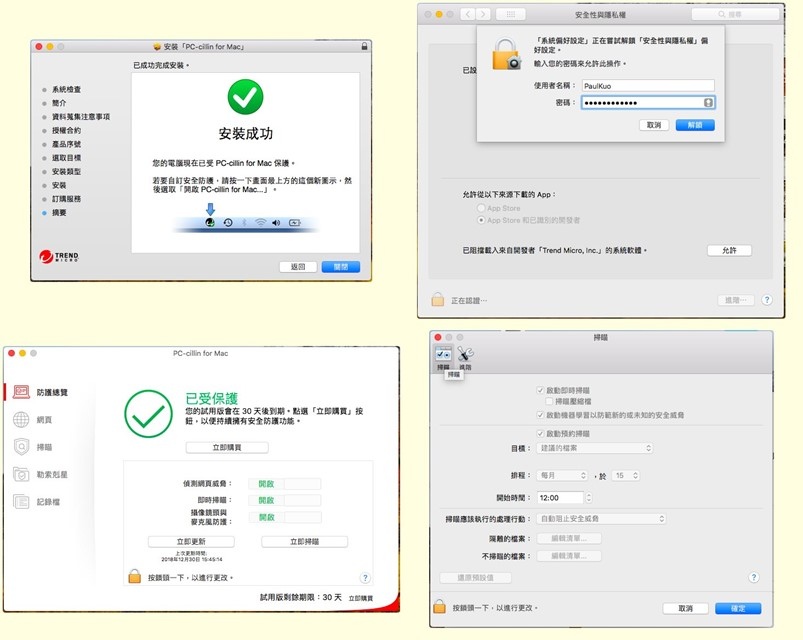 Mac版由於環境較於封閉,因此Mac版的功能較少於Windows版,一樣擁有檔案的即時防護、網頁瀏覽的安全、勒索剋星等,另外多了攝影機與麥克風的存取防護,而在安裝時需要另外允許相關權限,才能有完整的防護功能!
