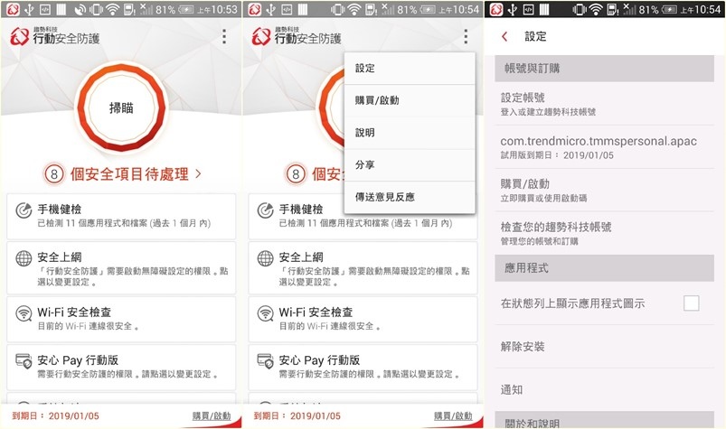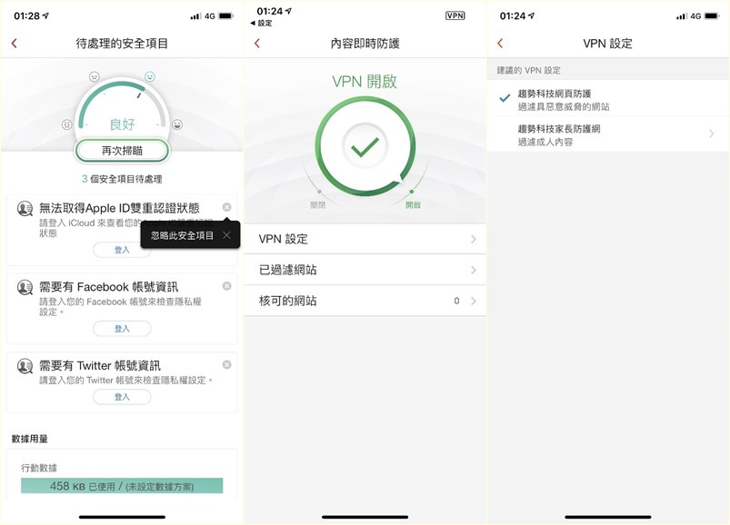 一樣有提供上網內容的即時防護、安全上網的功能,隱私權檢測、Wi-Fi安全檢測等功能,而其他大部分為手機的設定檢測,就列截圖給大家參考,因為功能大多重複就不一一說明