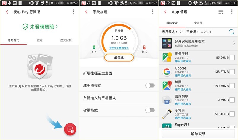 而在手機版也提供了安心Pay行動版,提供安全的交易環境,另外也有類似電腦優化的系統加速功能,還有App的統一管理,可以說是電腦有的功能在手機版本上也大多都有提供!