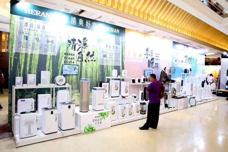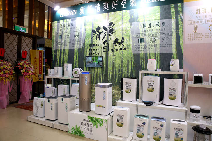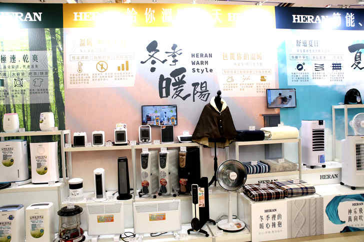 房間內用的現場有展示空氣清淨機、除濕機、各種類的冬天保暖產品與電扇組。