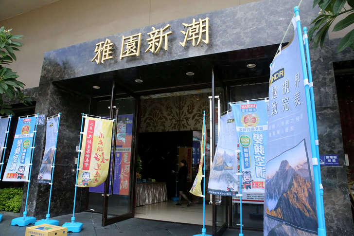 當天也是禾聯的經銷商大會,基本上到現場的都是中部地區的電器行老闆、技工人員,而地點就選在最熟悉不過的雅園新潮婚宴會館(最近剛好要結婚,瘋狂找尋相關資訊),中午時刻抵達現場入口處已經插滿各系列產品的關東旗。