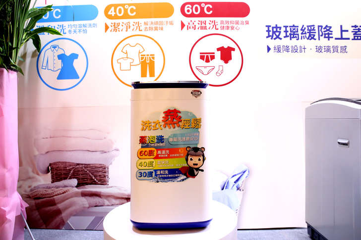 這邊比較有趣的是這台小型的多合一洗衣機,除了洗衣外還附帶高溫蒸洗功能,在產品定位上的目標客群主要是給外宿需求的消費者,或當成是家裡第二台專洗貼身衣物的洗衣機。